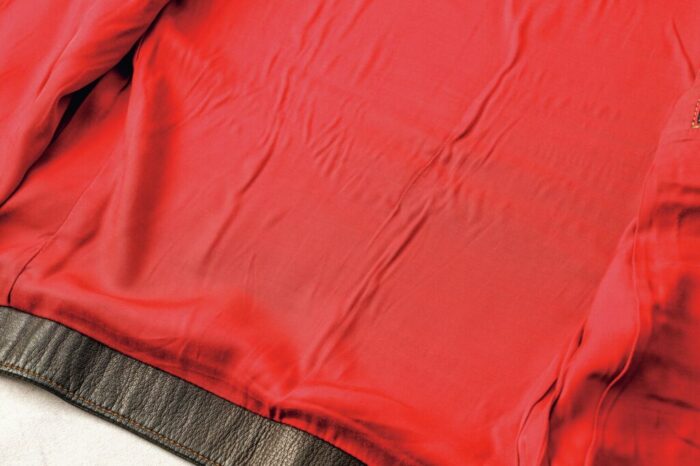 フラットヘッドの革ジャンはレーヨンカルゼと呼ばれる滑りのよい生地を使用している。カラーリングは鮮やかなレッドが標準色だ。