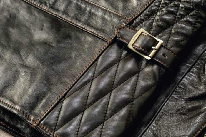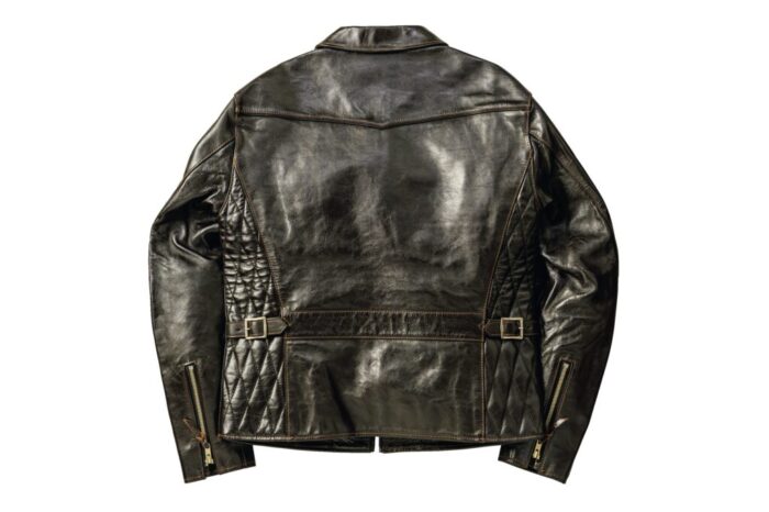 冒頭で紹介している馬革のシングルライダースをベースとし、ワキ腹部分にキルティングステッチを施したカスタム仕様。転倒時などの衝撃吸収はもちろん、デザイン面でも個性を強めたフラッグシップモデルだ。縫製はフラットヘッドの自社工房「ストックバーグ」の職人たちの手仕事によるもので、プレミアム感も堪能できる。30万8000円〜