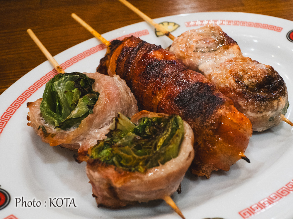 で、暖簾には「炭火野菜巻き串と餃子」とあるので、まずそれを味あわなければ始まらない。
