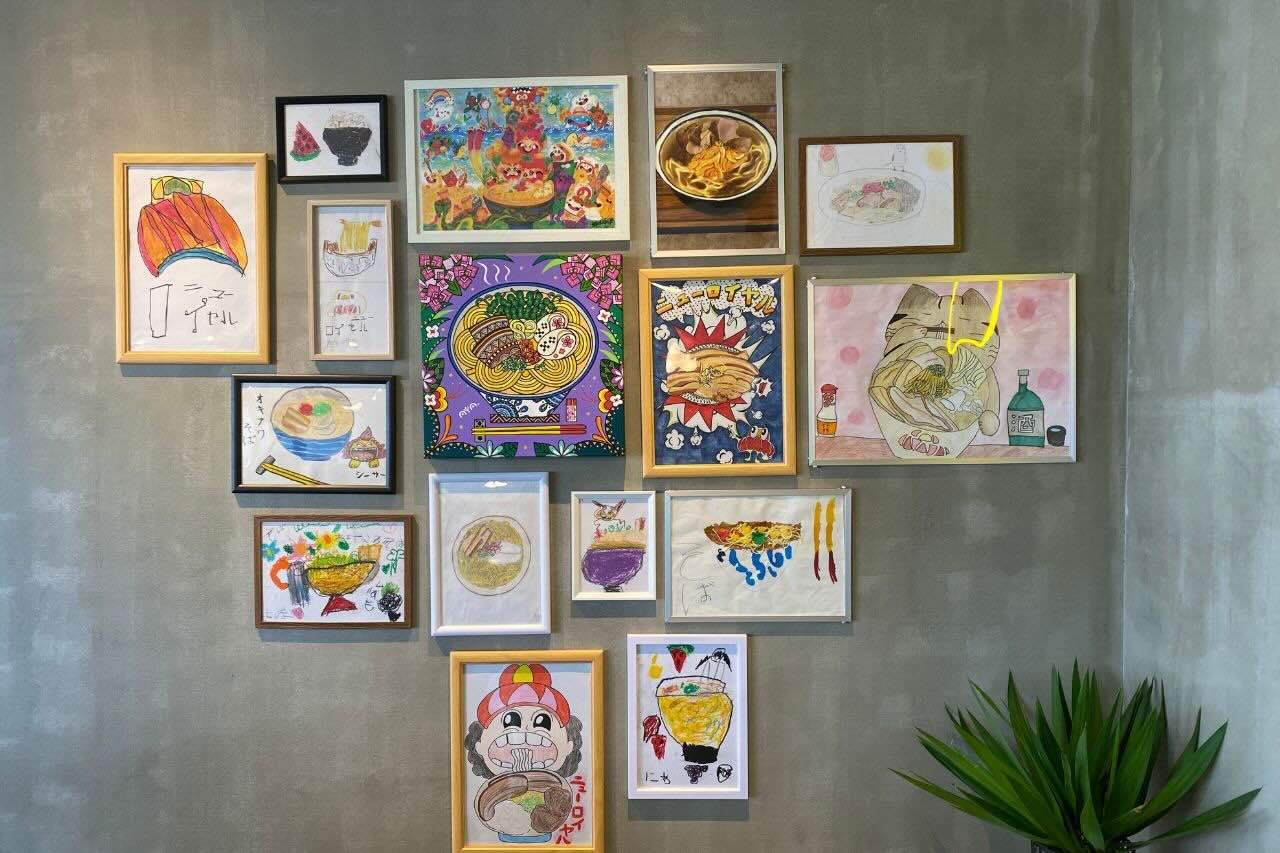 壁には、お店の周年イベントの際にお客さんが描いた「沖縄そばのイラスト」がずらり。個性的でかわいくて、ほっこりします。