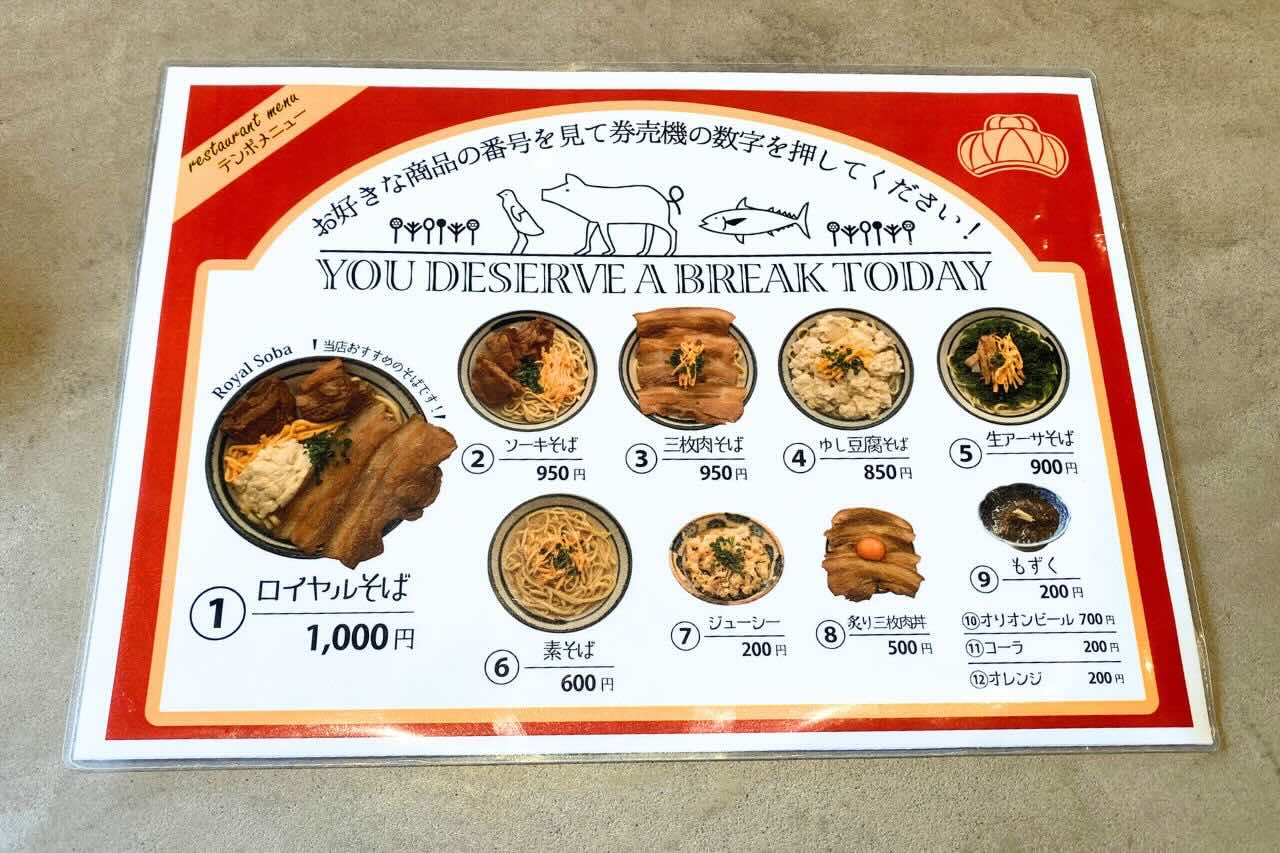 看板メニューの「ニューロイヤルそば」をはじめ、「ソーキそば」、「三枚肉そば」、「ジューシー」に「炙り三枚肉丼」と種類も豊富です。