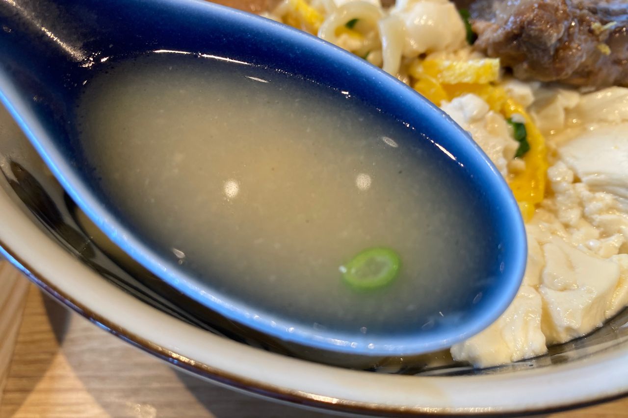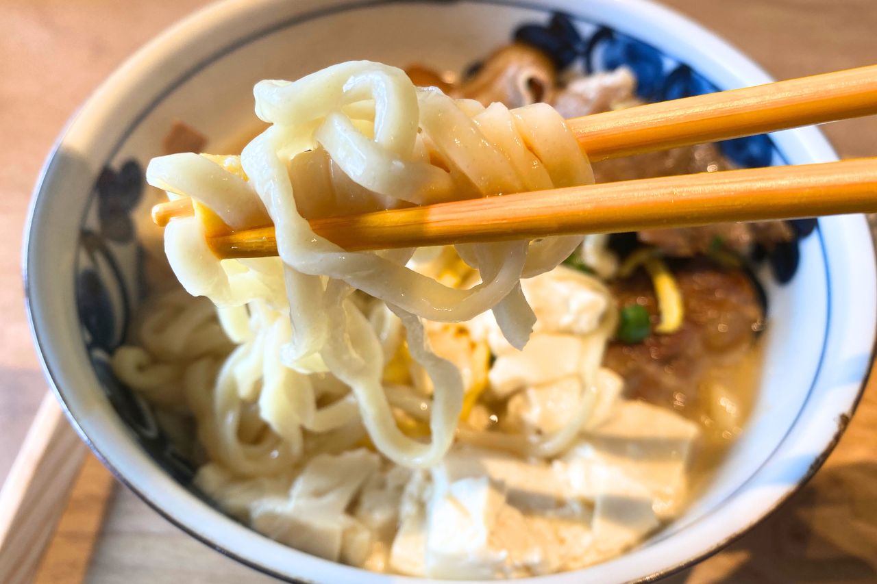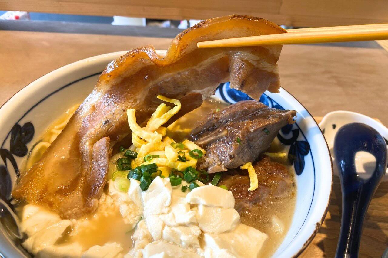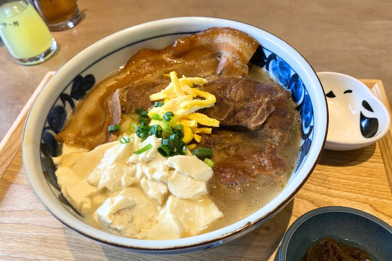 志林川豆腐のやさしい甘みと、平良製麺所のもちもちストレート麺、そしてオバー直伝のスープが合わさって、口いっぱいに旨みがじゅわっと広がります。