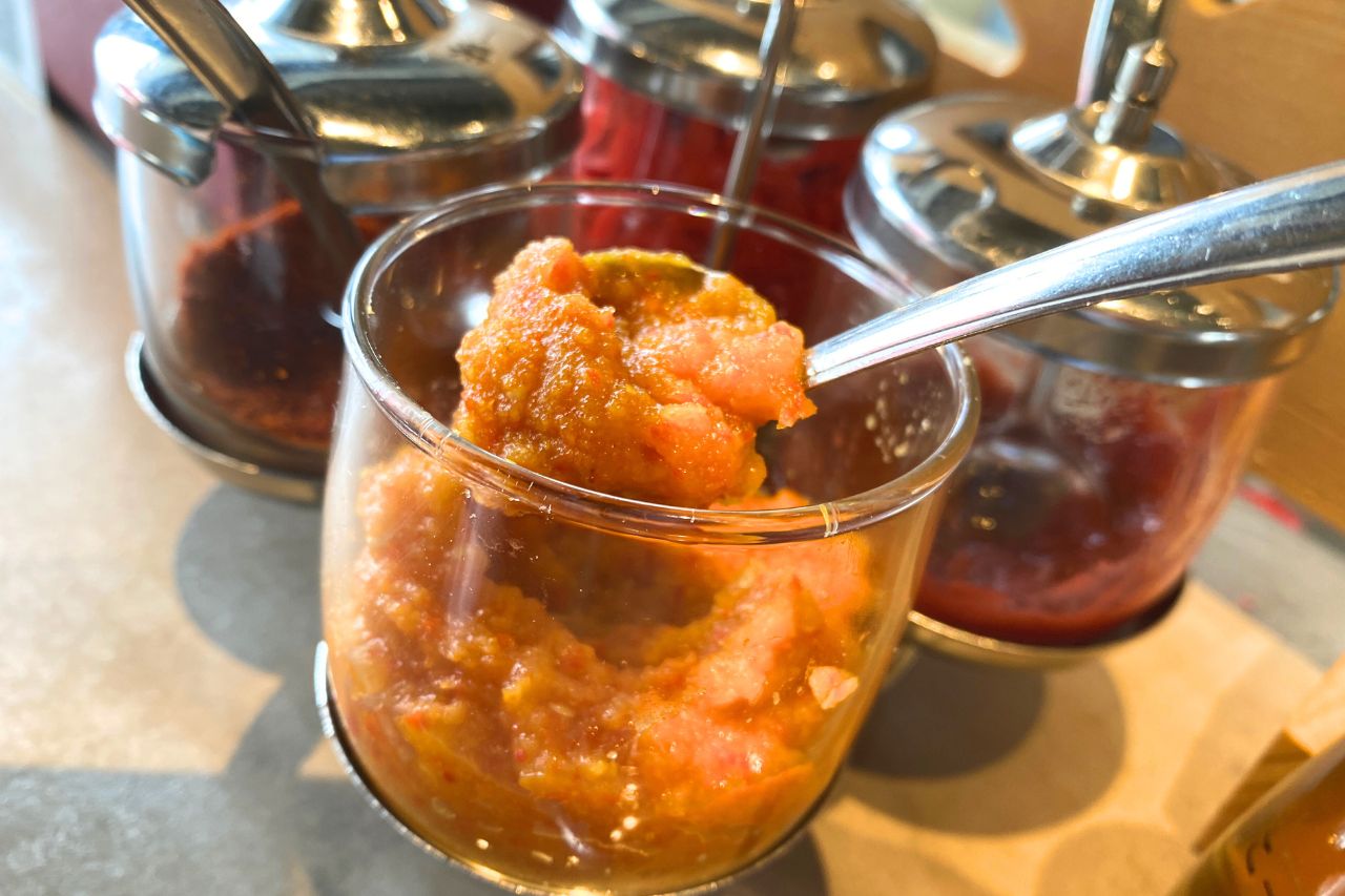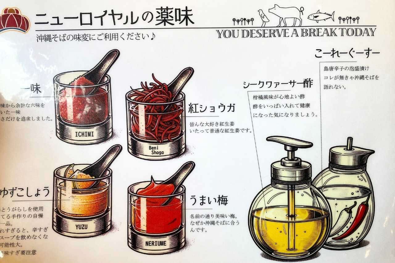 沖縄そばの定番調味料といえば「コーレーグース」や「一味」ですが、「ニューロイヤル」では“推し調味料”が卓上にならんでいます。さっぱりとした「シークヮーサー酢」、旨みたっぷりの「うまい梅」は、酸味が沖縄そばのおいしさを引き立てる、新たな発見です。
