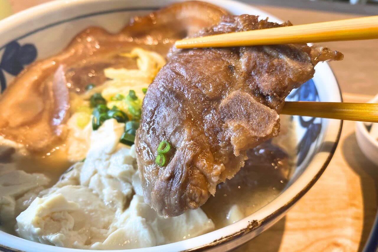 どんぶりからはみ出しそうなほど長い三枚肉に、ほろほろ柔らかい骨付ソーキ、プルプル軟骨ソーキと、お肉はどれも柔らかく仕上がっています。