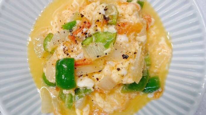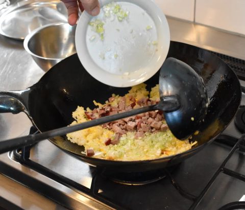 卵のふちが固まり、まだ液状の部分が残っているうちにご飯を入れて炒める。