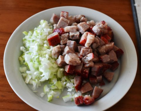 1 ねぎはみじん切りにし、チャーシューは1㎝角に切る。