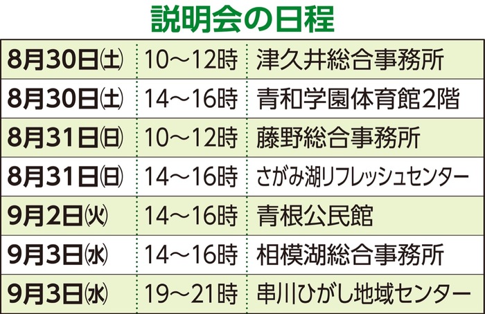 さらに、これらの実証運行について、市による説明会が8月下旬から開催される(表参照)。会場は各地区の総合事務所など7カ所。内容はどの会場も同じ。予約不要のため参加希望者は直接会場へ。