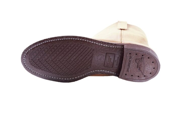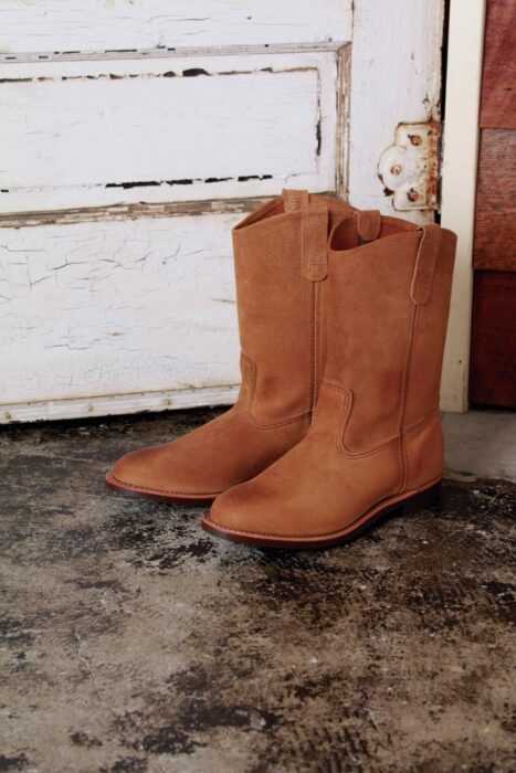 ウエスタンブーツスタイルではあるがトゥは尖っておらず、クラシックな印象。きめ細かなフルグレインのラフアウトレザーはひと目で上質なものとわかり、耐久性が高い上に足馴染みが良いのが大きな魅力だ。白底ペコスと同じ17番ラストを使用しており、ヒールベースが入っていないため、安定感のある低めのヒールに仕上げた。