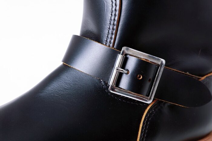 エンジニアブーツの最大の特徴である甲部分に装備されたアジャスターベルト。筒の上部にももうひとつ小ぶりなベルトが付けられている。湾曲のある高めのヒールとスチールトゥから樹脂トゥに仕様変更しながらも美しいトゥデザイン、さらには茶芯レザーを採用することで、エイジングも履く人の個性が表現されるのは興味深い。