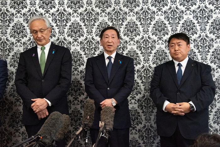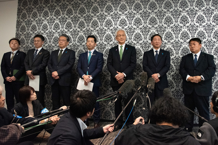 《画像:報道陣の取材に応じる7首長》