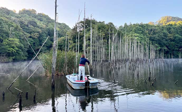 5時30分、10ftブラックホーク(免許不要艇)に乗り込み出舟。とはいいつつ、吉田の非力エレキでは常連とボート競争したところで勝ち目はない。ならばと10人ほどの出舟者すべてを見送って、空いているポイントに入ったほうが得策だ。