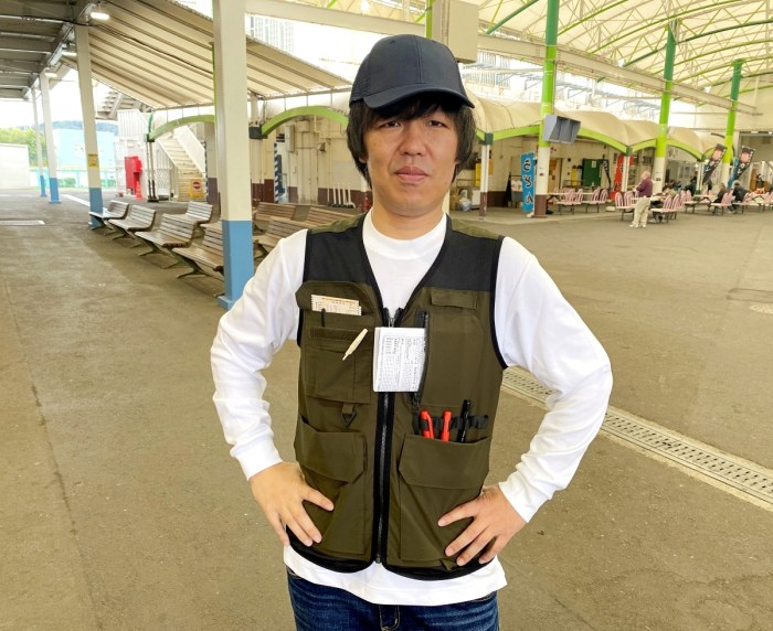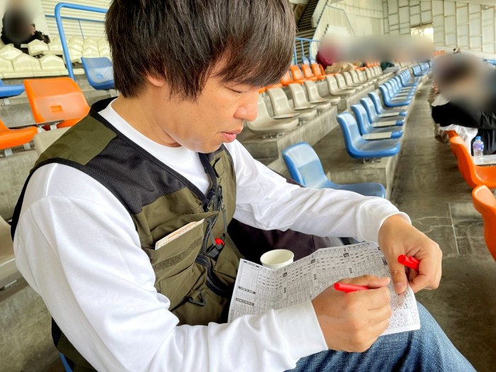 こんな分かりやすい風貌のおっさんがいるだろうか? ポケットだらけのベストに(どこに売ってんの?)、マークシートやペンがやたらと差さっている。絵に描いたような「競艇場のおっさん」である。