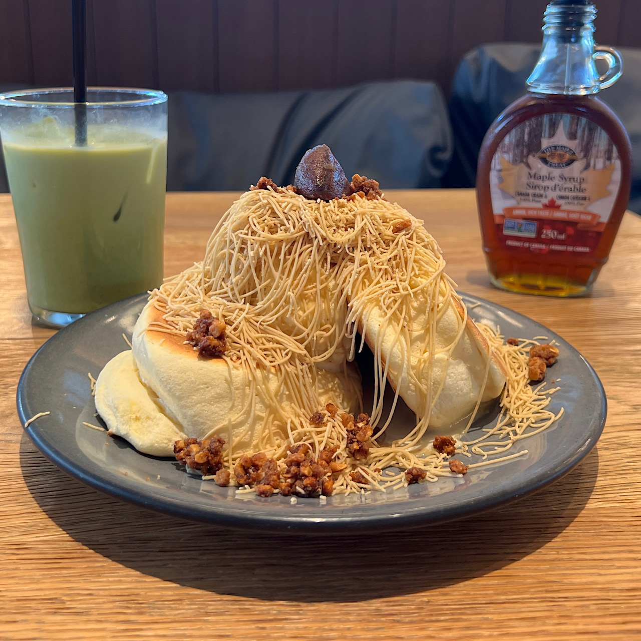 ふわふわのスフレパンケーキが2枚、その上にモンブランがたっぷり。まさに山のようです。