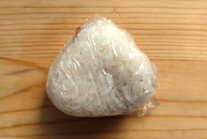 3.ラップごと包んでおにぎりの形に握ります。