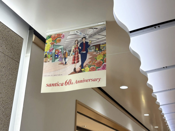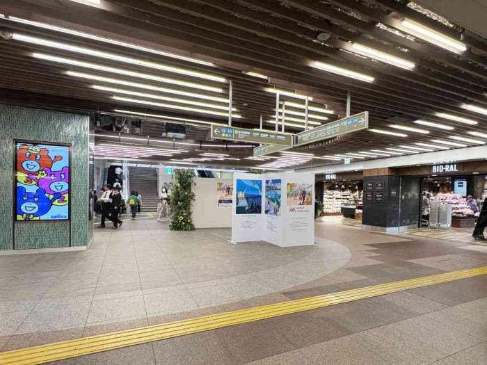 メインビジュアルは、天井やドアなど館内のさまざまな場所にも掲出されており、「さんちか」全体がお祝いムードに包まれていて、こちらまでウキウキします。