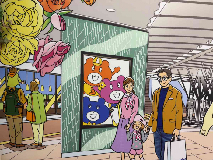 向かって左側にあるグリーンの壁に描かれた「さんちか」のキャラクター「さんくま」も、作品の中にしっかりと登場していますよ。