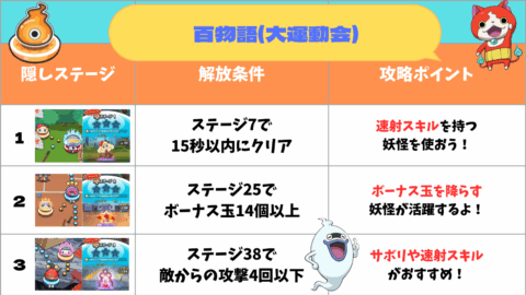 妖怪ウォッチぷにぷにで開催中の「百物語(大運動会)」のイベントマップに登場する隠しステージの解放条件を紹介します。