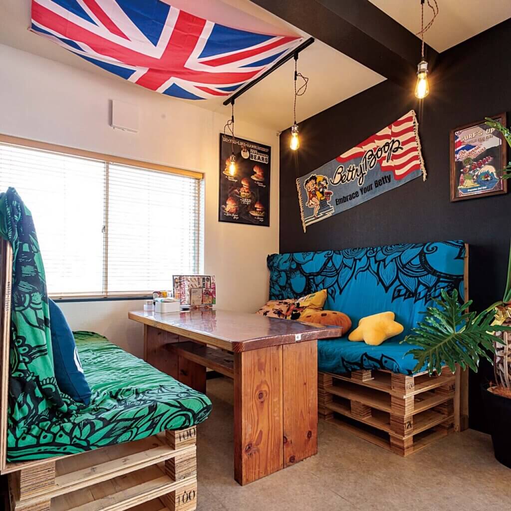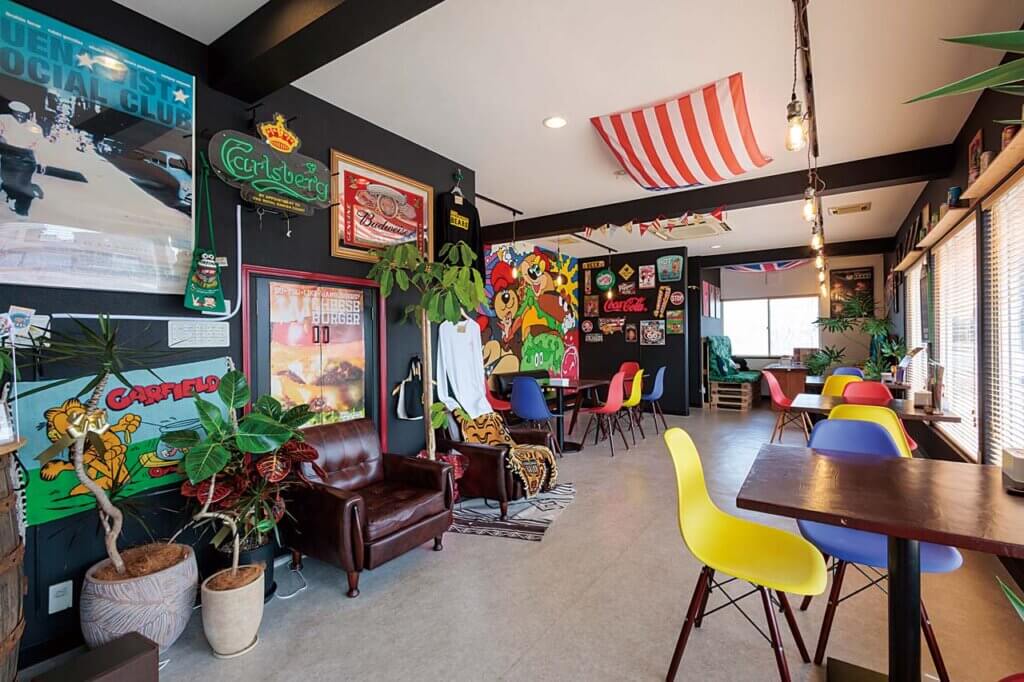 看板やウオールアート、インテリア、小物など、細部に至るまでアメリカンムードで統一された店内。長居したくなるボックス席もあります。