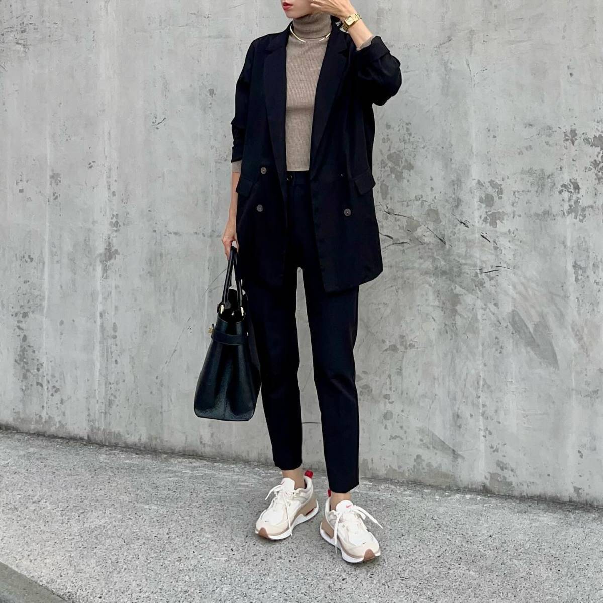 黒ジャケットに黒パンツを合わせたときのインナーは、ベージュのタートルネックを選ぶと◎
