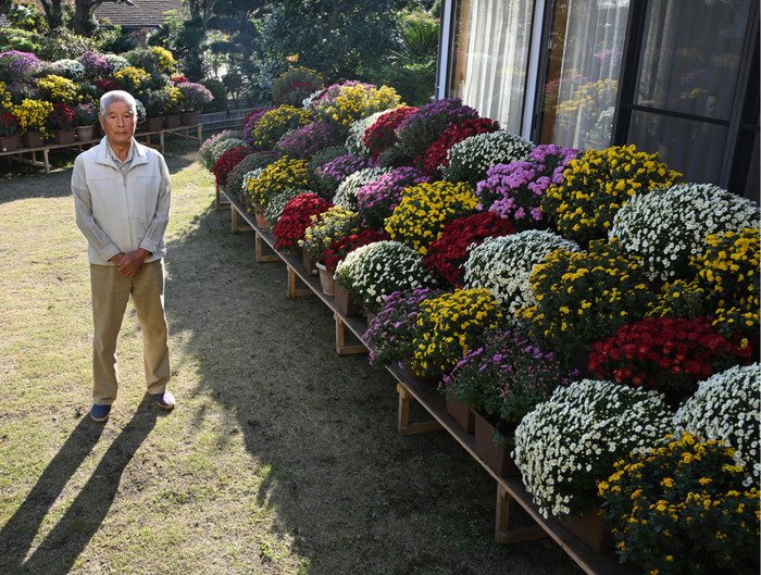 横浜市旭区今宿南町で農園を営む栗原成美さん宅の庭に飾られた「ざる菊」が見頃を迎えている。11月末頃まで庭を開放し、自由に観賞できる=写真。