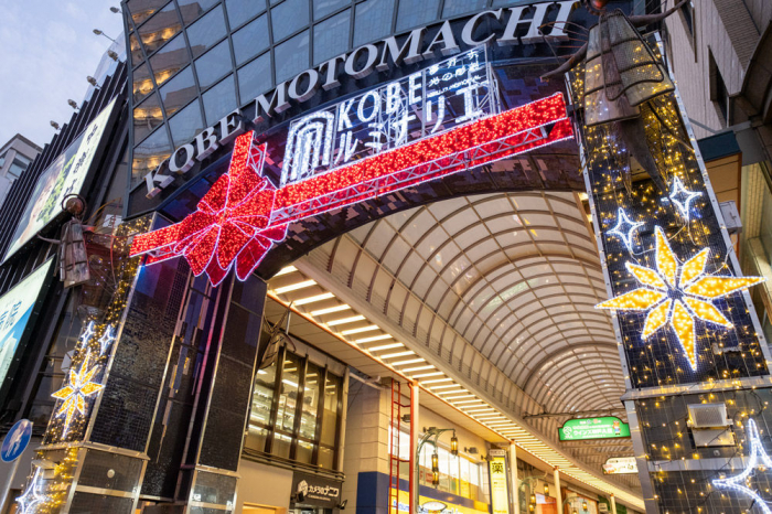 12月に入り、ホリデーシーズンの雰囲気でにぎわう神戸の街。大丸前の交差点で信号待ちをしていると、『神戸元町商店街』(神戸市中央区)入口に施された、きらびやかなイルミネーション装飾が目に飛び込んできました。