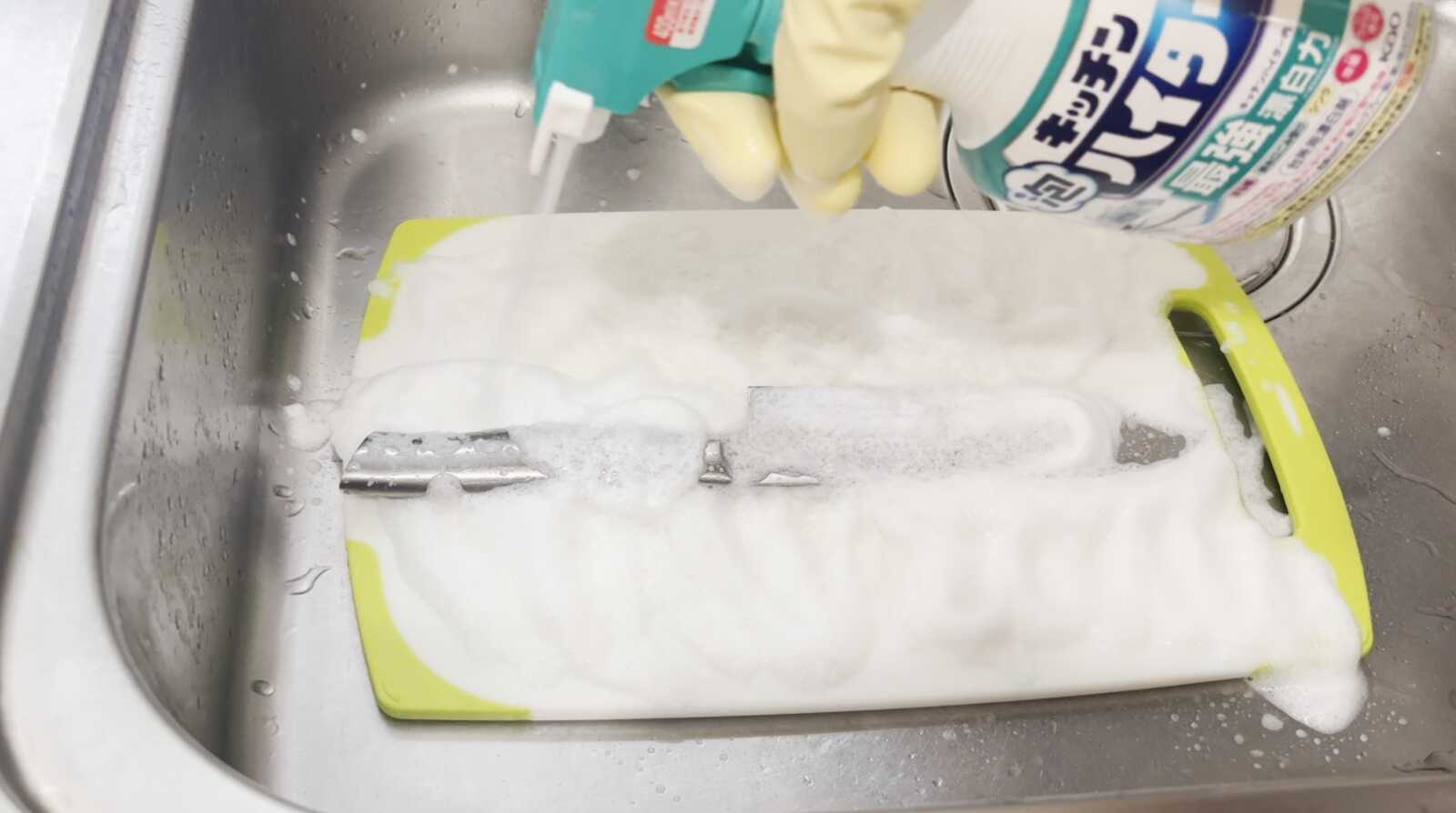 まな板や包丁は、料理で毎日使うため、見た目以上に菌が付着しやすい場所です。キッチン泡ハイターなら、こうしたキッチンアイテムも簡単に除菌ができます。
