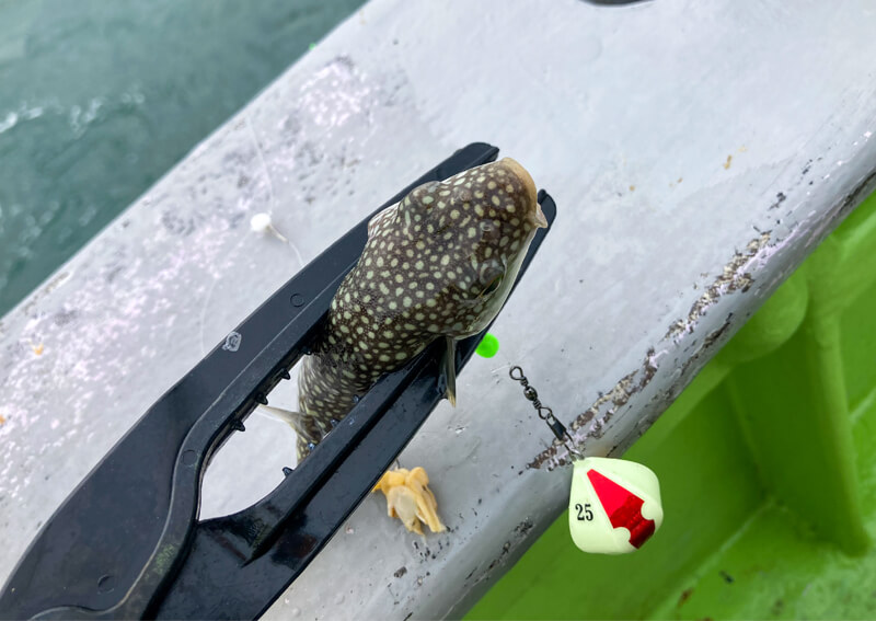ゆっくりとフォールで誘いを入れると、いきなりヒット。上がってきたのはコモンフグ。幸先よく1尾目をキャッチしたものの、そのあともフグの入れ食いが続きハリス切れが多発……(泣)。それでも脱着式仕掛のおかげで予備の替えバリに素早く交換し、テンポよく釣りを続けることができました。