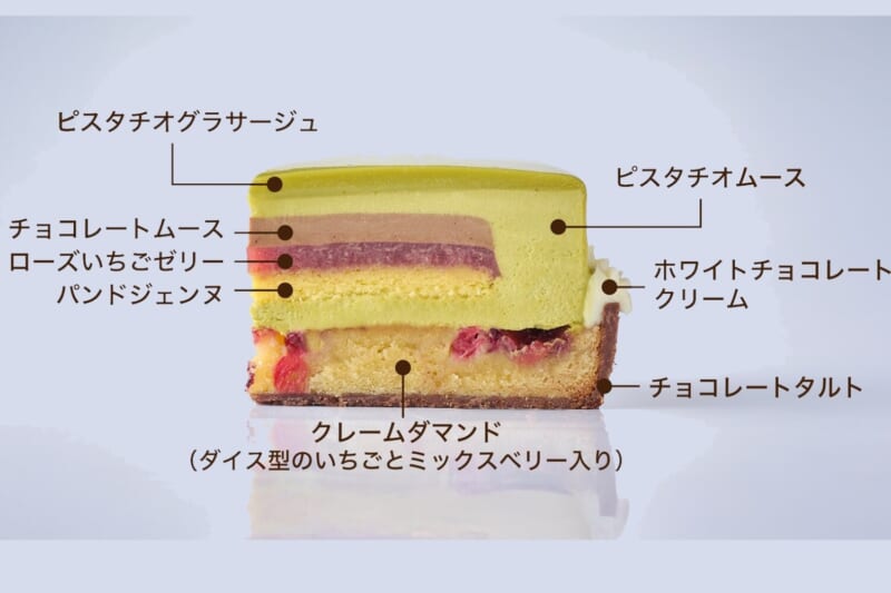 鮮やかなグリーンの部分はピスタチオムース。その中には、チョコレートムース、ローズいちごゼリー、そしてパンドジェンヌが重なり、美しい層をつくり出しています。さらに、土台にはいちごとミックスベリーが入ったクレームダマンドが敷かれており、ケーキ全体をやさしく支えています。周りを囲むチョコレートタルトがサクサクとした食感を添えてくれるのも、うれしいポイントです。