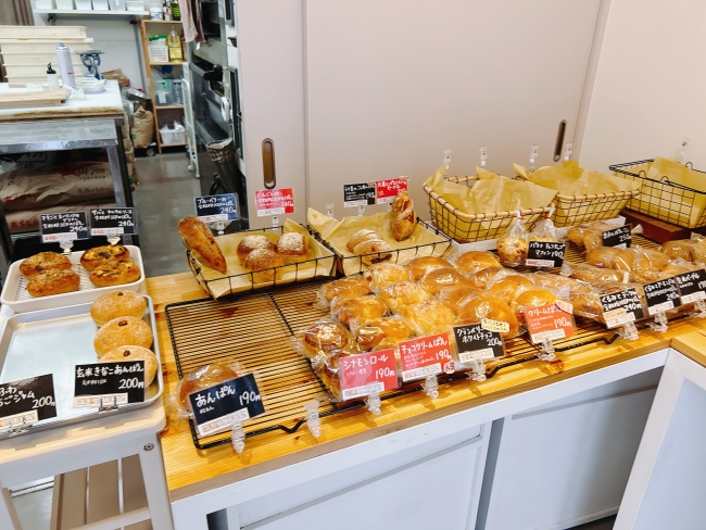 店内は白を基調とした、明るく清潔感のある空間。2〜3人も入ればいっぱいになるほどこぢんまりとしていますが、すぐ目の前のカウンターには、愛情込めて作られたパンがたくさん並んでいます。