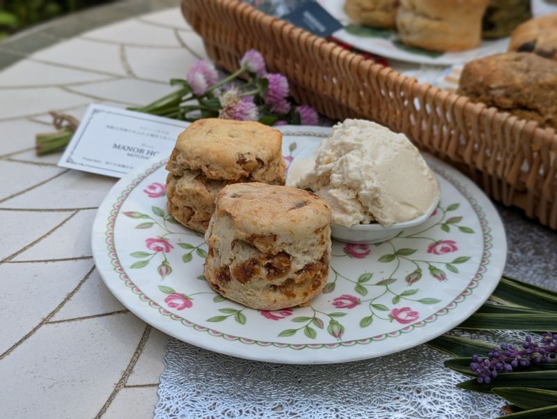 「tea room MANOR HOUSE MOTOYAMA」のホームメイドスコーンと自家製マヌカハニークロテッドクリームのセット