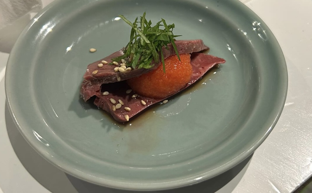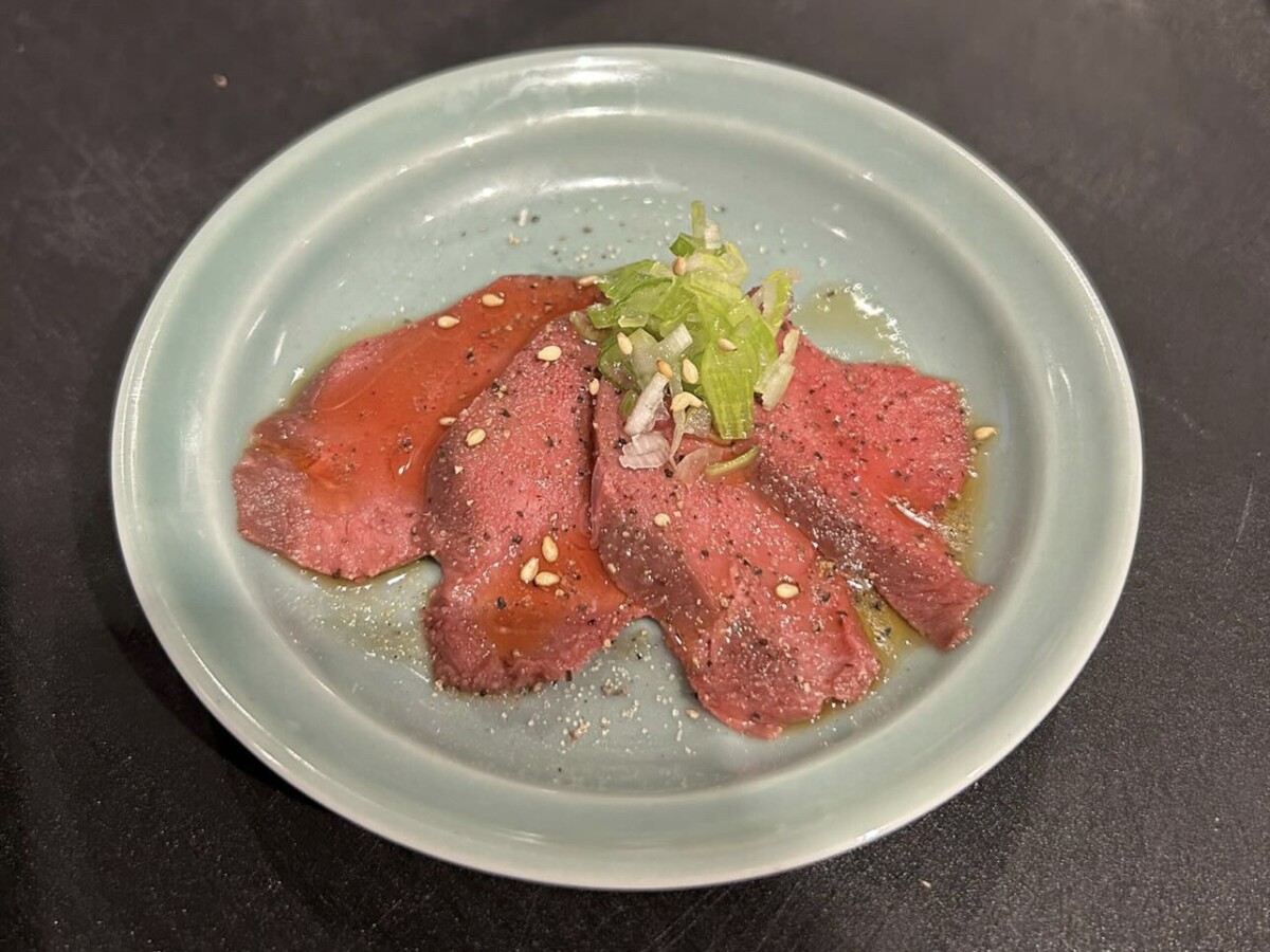 牛のハツ刺しは、低温調理でじっくり火を通し、ごま油の香りと塩コショウの風味が相性抜群。お酒が進む一品です。