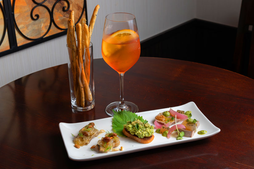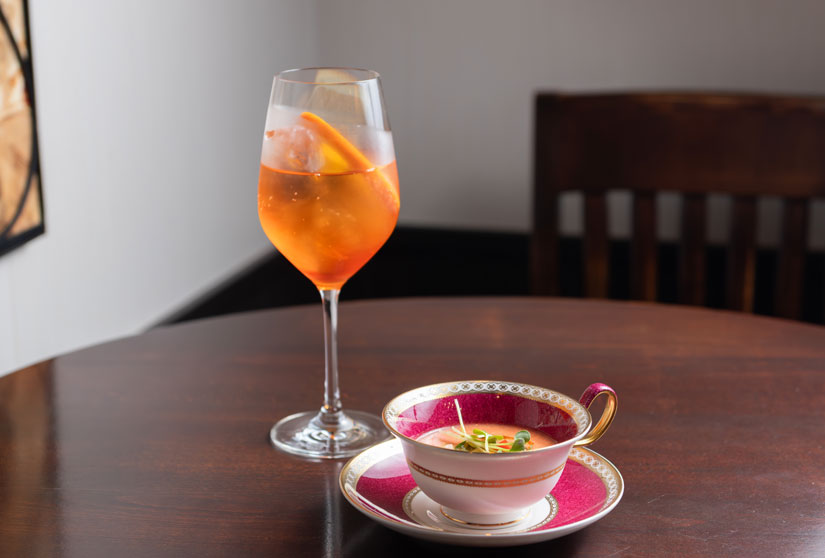 野菜の冷製スープのペアリングはイタリアのカクテル「スプリッツ」。食前酒として楽しまれ、オレンジの甘みとハーブの苦みが特徴。