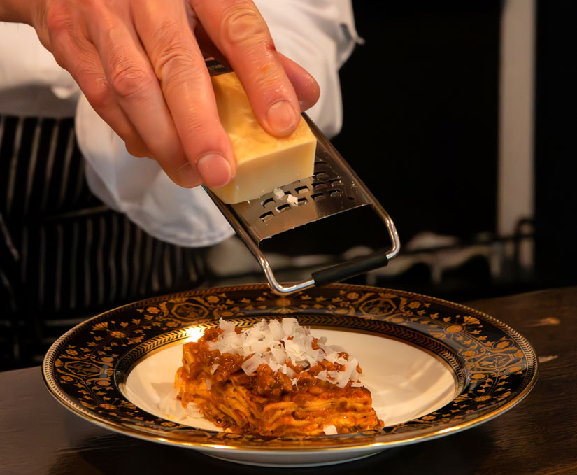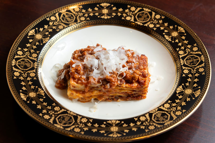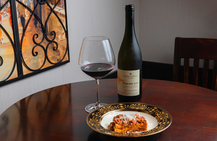 ボローニャ地方の微発泡赤ワイン「ランブルスコ」は、同じ土地の郷土料理・ラザニアとの相性抜群。「イタリア料理のペアリングは、不思議なほど同じ地域のワインがぴったり合うんですよ」