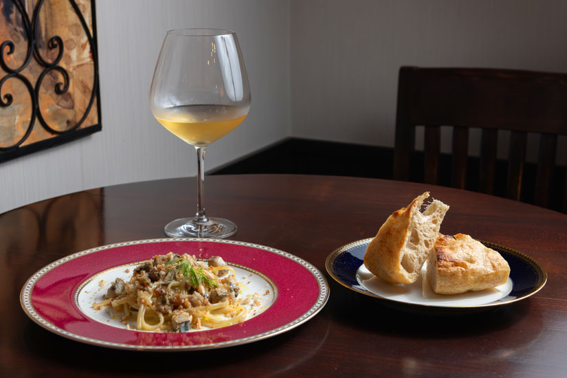 ペアリングのワインは南イタリア産「ファランギーナ」。「サンマのリングイネ」に合わせ、海のミネラル感とトロピカルな香りが調和。
