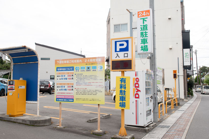駐車場はありません。近隣には有料駐車場もあり、「下道駐車場」からは徒歩1分。