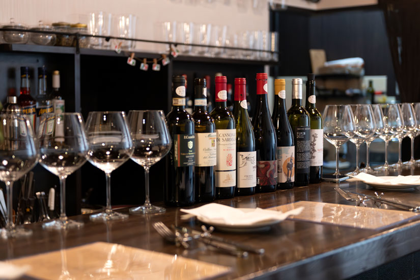 ワインはパートナーの神津妙子さんがセレクト。イタリア各地の小規模ワイナリーによる自然派ワインを中心に、料理との調和を大切にした銘柄が揃います。