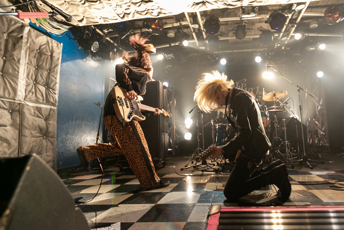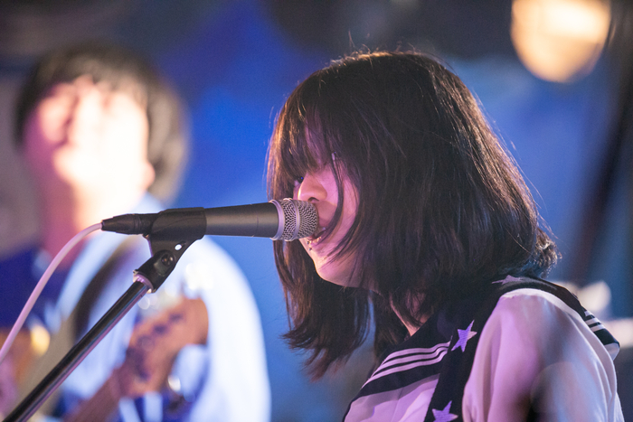 体格が立派な男性メンバー・タケマスター(G・Cho)、ふじお(Ba・Cho)、林田翔馬(Dr・Cho)と一緒にステージに登場したオニザワマシロ(Vo・G)。「シティガールってどういう意味か知ってますか? 私みたいな東京生まれ、東京育ちのキュートでかわいいガールのことを言うんじゃなくて、東京に染まった、東京が似合う、それはそれは美しい女の子のことを言うらしいです」という彼女の言葉と共に「City girl」がスタート。開放的に踊る観客を回転するミラーボールの光が妖しく照らす。そして「熱中症」、新曲「東京」、「バカマ●コあかり」も次々届けられた。「可愛いユナちゃん」の途中で、自分のことを鏡で見ると幻滅すると語ったオニザワ。「私がこのイベントの初回にオープニングアクトで出て、そこからずっと出てるのは、私がずーっと鬱屈してるからだと思います。かわいいあの娘には勝てない重い呪いがかかっていて、この歌を歌って呪いをかければかけるほど、自分に返ってくるんです」と言った後、歌声の熱量を高めていた。