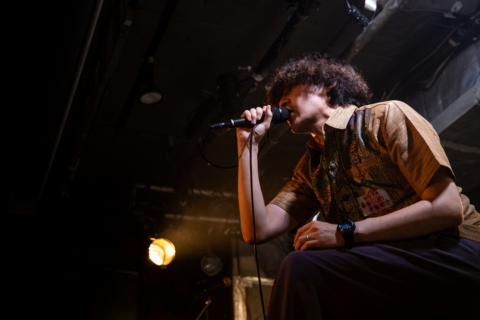 本番前の楽屋で他の出演者たちと何も喋れなかった旨をMCで語ったボーカル・にしむぅ。しかし、ステージ上での彼はなかなか饒舌だった。「私は大阪の人間なんで土地勘ないですけど、新宿歌舞伎町でお前らのような鬱屈したやつらはアウェイなんだ。ただでさえアウェイな君たちがアウェイな最強マンボウ修羅ぼうやを観に来て、今年の夏は大失敗だあー!」――そして「マンガの世界に飛び込みたい」に突入すると、激しい手拍子がフロア内で沸き起こった。続いて、ムード歌謡のような哀愁のメロを響かせた「やみやみ」。スピーディーな展開とダンスビートの併せ技で観客を踊らせた「逆張りダンス」。ラストを飾ったのは、にしむぅの歪んだ声質のシャウトが冴え渡った「麻婆拳法斃炒飯」。得体の知れなさを終始放っていたが、ライブを観た後に抱いた感想は「かっこいい!」に尽きる。彼らの唯一無二の魅力と出会えたのは、このイベントでの早速の収穫だった。