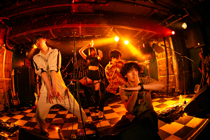 新宿LOFTのステージに最初に登場したのは、最強マンボウ修羅ぼうや。彼らのXのプロフィールに「6秒待たず大激怒 逆アンガーマネジメント音楽」と書かれていたが、どのようなバンドなのだろうか? そして迎えた開演。ステージを覆っていた幕が開いた瞬間、戦隊ヒーローのようなポーズを決めた4人・にしむぅ(Vo/修羅)、糊玉(Gt/ぼうや)、マユち(Dr/最強)、おんじ(Ba/マンボウ)が姿を現して「小池億合子が」がスタート。シャープに刻まれるビート、ファンキーなベースラインがダンスを誘った。どことなく怪訝そうにしながらも徐々に身体を揺らして踊り始めた観客。アボカドに8時間シールを貼り続けるアルバイトの作業をイメージした腕の動きと大合唱を観客に求めた「アボカドファクトリー」。アグレッシブな爆音を炸裂させた「1700」……ファンク、ハードコアパンク、ラウドロックが強引に一体化したかのようなサウンドの連続だった。