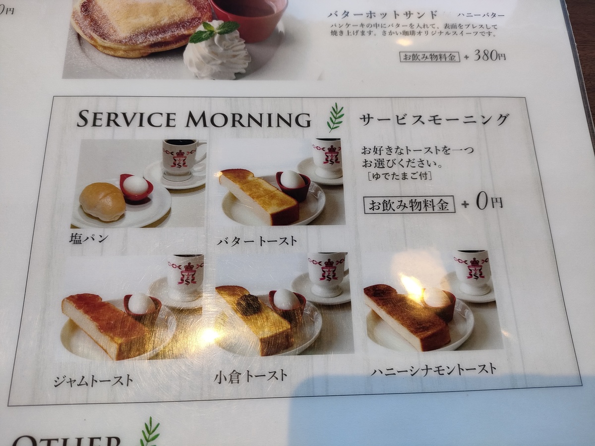 また、このサービスモーニングは全部で5種類もあり、他店にはないバリエーションの多さがさかい珈琲さんの魅力とも言えますね。