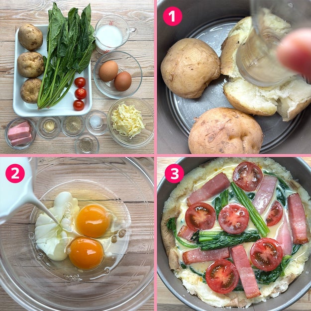 ③ ①に②に注ぎ入れ、半分に切ったミニトマトをのせる。200℃に予熱したオーブンで30分焼いたら、完成!