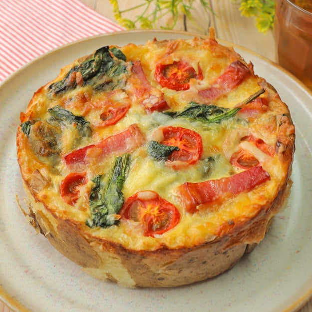 卵液とベーコンやほうれん草などの具材を流し込み、オーブンで焼くだけ。手軽なのに見た目も華やかで、朝食やランチ、おもてなしにもぴったり。パイシートを使わない節約アレンジとしても人気の、失敗しにくいキッシュレシピです。