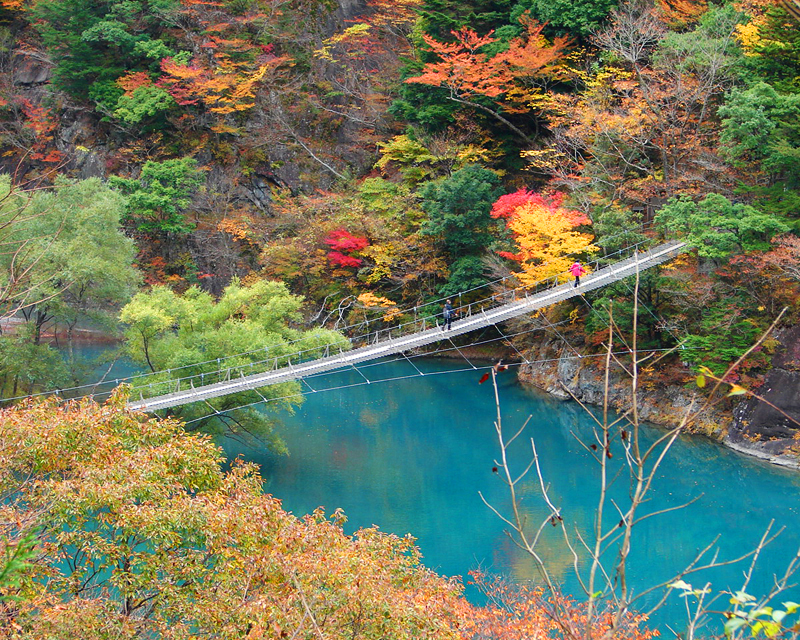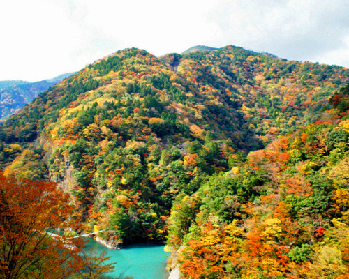 「夢の吊り橋」に代表されるフォトジェニックな吊り橋や眼下に広がる美しいエメラルドグリーンの湖など、風光明媚な自然がいっぱいの寸又峡。12月上旬まで紅葉を楽しめます。