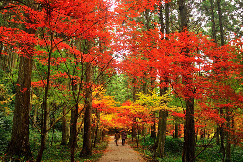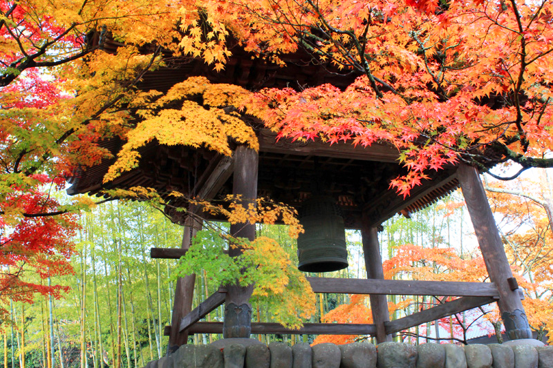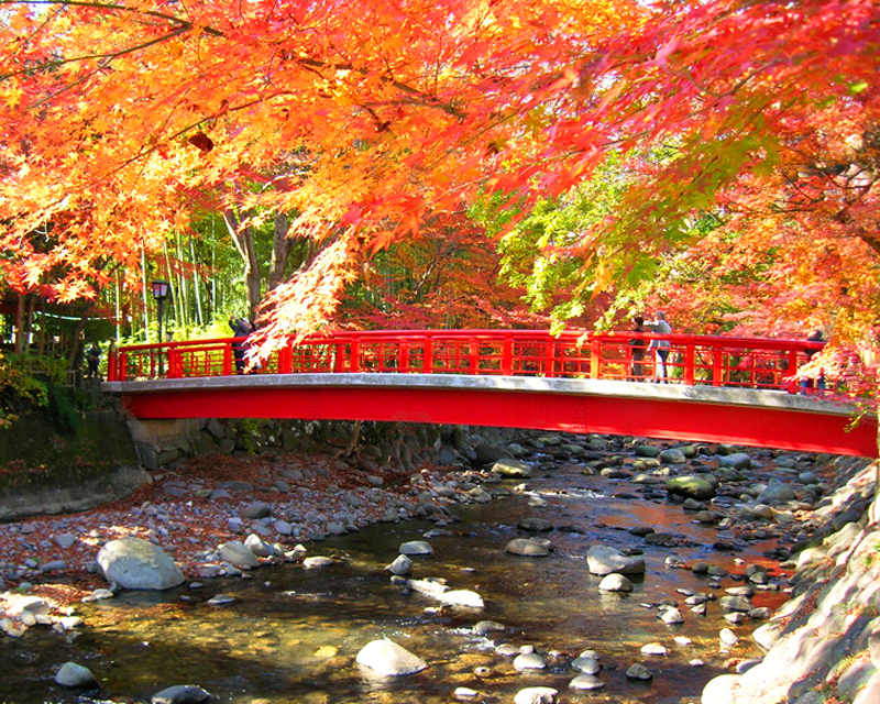 情緒たっぷり、歴史ロマン香る温泉街の紅葉を楽しむならこちら。修善寺温泉街の中心を流れる桂川沿いの散策道「竹林の小径」に60本、修禅寺境内に10本ほどのモミジが鮮やかに色づきます。