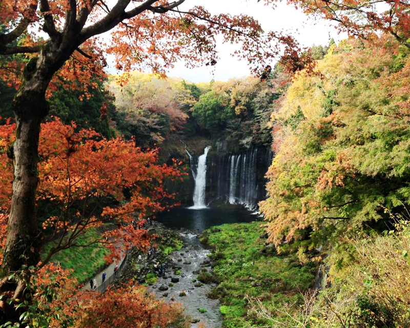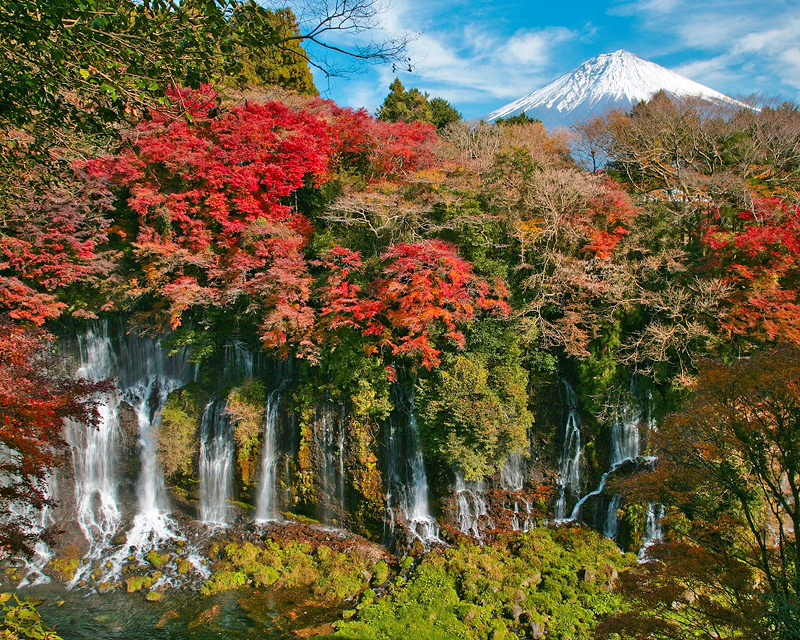 ゆるやかにカーブする絶壁の全面を、富士山の雪解け水が数百の絹糸のように滑り落ちる「白糸の滝」。散策コースの展望台まで登れば、雪化粧した富士山、滝、紅葉が望める絶景ポイントです。