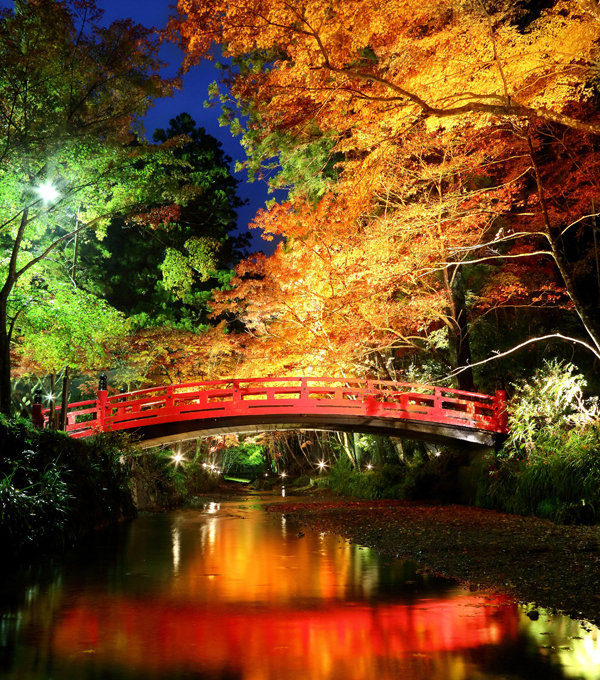 どこを切り取ってもフォトジェニックな1枚に。古代の森「小國神社」では大小約1000本のモミジが紅葉します。赤や黄色に染まった紅葉が宮川に映し出され、心を和ませてくれます。ライトアップされた光景は昼とは違う趣で一見の価値ありです。