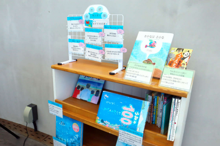 さっそく中に入ると、日陰になっているのはもちろん扇風機などが設置されておりかなり涼しい!生き物にちなんだ図鑑や絵本が約100冊設置されており、磯遊びを楽しんだ後に学びを深めることができます。