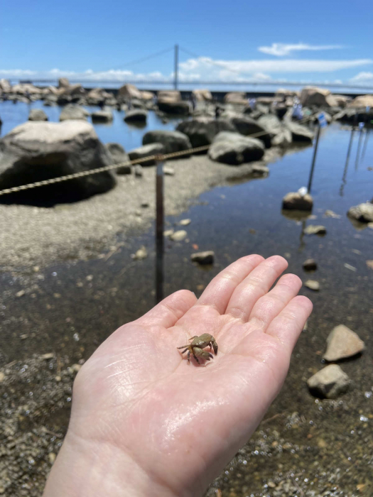 記者が濡れない範囲から眺めるだけでも「あそこにカニ、小さい魚もおるな…」と目視で確認することができ、この日は濡れることなくカニを観察することができました!