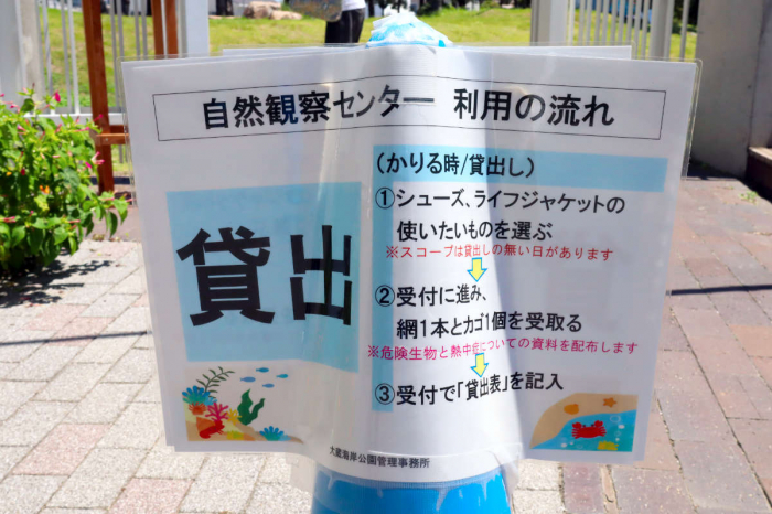 センターは午前10時からで、マリンシューズやバケツ、網、ライフジャケットなどといった観察資材を無料で借りることもできます。記者は11時ごろ到着したのですが、この時点ですでに全ての資材が貸し出されていました…!