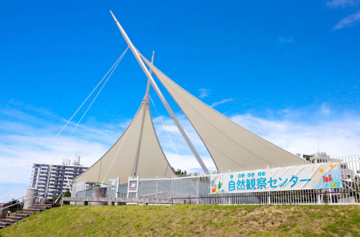 「自然観察センター」は白くて大きな屋根が目印。近くには綺麗で大きな洗い場もあるため、ここで汚れを落とすことも可能です。